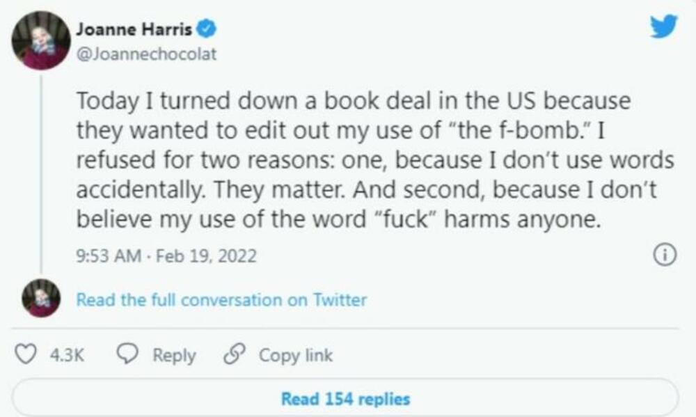 Britanska književnica Džoen Heris otkrila je da je odbila novu saradnju s američkim izdavačem koji je od nje tražio da iz knjige izbaci upotrebu reči "fuck", piše "Njujork tajms".