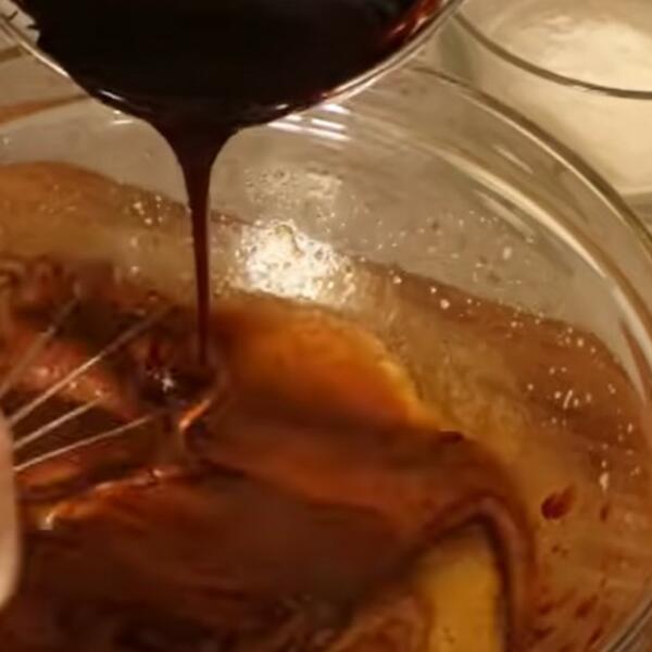 Sada pomešati ove dve smese dodavanjem smese sa cokoladom u smesu sa jajima i sećerom.