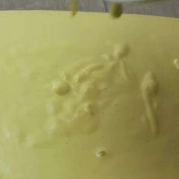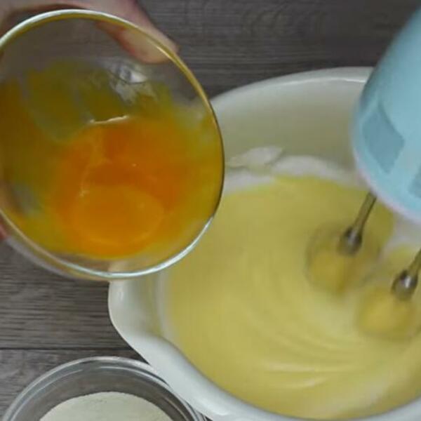 U masu lagano umešajte griz, prašak za pecivo i žumanca, pa sipajte smesu u kalup koji ste prethodno premazali mašću ili uljem i posuli običnim belim brašnom.