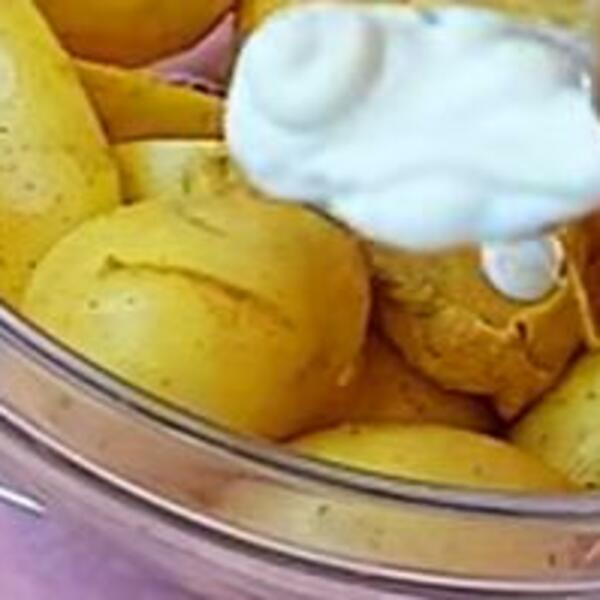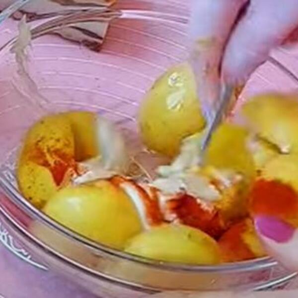 Krompiriće dobro oprati, ako su krupniji iseći na pola. Posoliti, dodati senf, majonez, biber, origano, paprku, seckan beli luk i ulje.