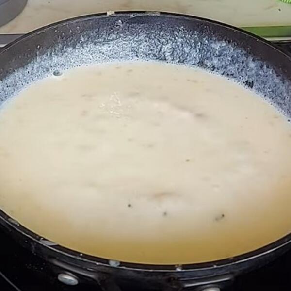 Dodati mleko i malo vode. Kad prokuva, skloniti sa šporeta. Sipati testeninu, pa preliti sa bešamel sosom.