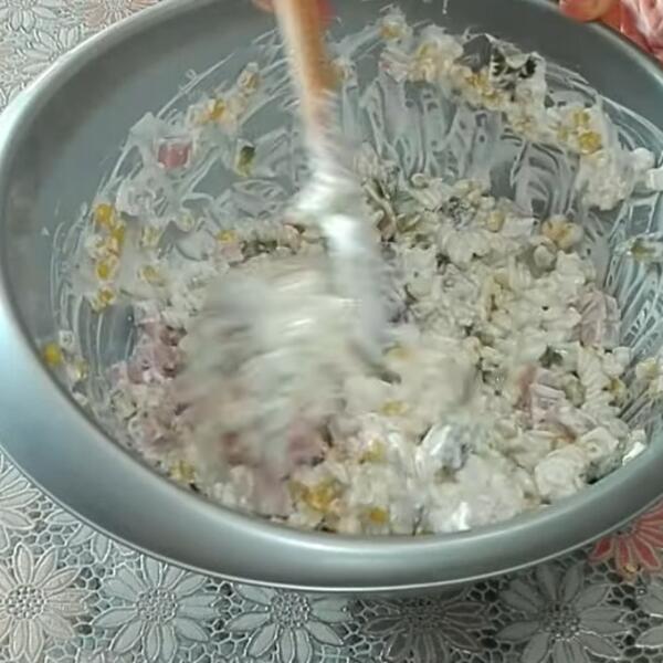 Iseckajte papriku i ćureća prsa na jednake, sitne kockice. Masilne isecite na polovine, a onda svaku na tri dela. Sve stavite u jednu činiju, pa dodajte pavlaku, majonez i kukuruz šećerac, pa dobro sjedinite. Makarone skuvajte u slanoj vodi. Ohladite ih i isperite pod mlazom hladne vode, pa dodajte ostalim sastojcima. Dodajte so, biber i ostale začine prema svom ukusu i ostavite salatu da se dobro ohladi.