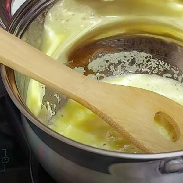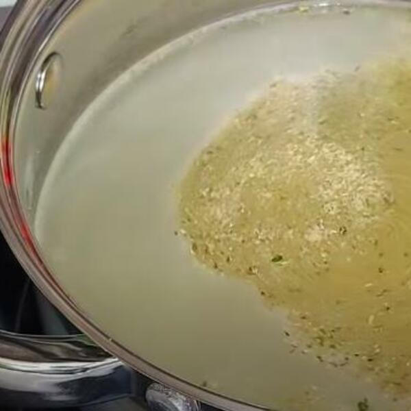 Na ulju propržiti da bude krem boje pa sipati vodu. Kad provri, dodati začin, so biber. Posle pet minuta dodati beli luk i peršunov list, poklopiti.