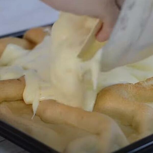 U sud staviti 2 dl vode i 125 g margarina da proključa. Kad proključa skloniti sa ringle i dodati šolju od 2 dl brašna i malo soli i dobro promešati. U još vruću smesu dodavati jedno po jedno jaje muteći smesu sve vreme. Dobijenu smesu podeliti na dva dela. U plehove veličine 37x37cm (od šporeta, možete uzeti i manje) staviti papir za pečenje na koji nanesete smesu u tankom sloju.