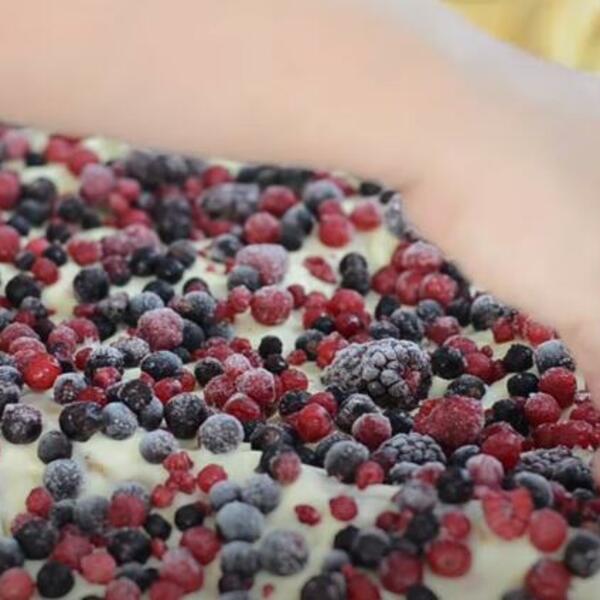 Zatim dobijenu smesu premazati preko prve kore. Preko toga staviti voće koje imate.