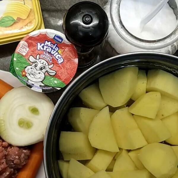 Izdinstati crni i beli luk na ulju, pa dodati meso i začine, a zatim šargarepu i grašak. Kada je meso braonkasto, znači da je gotovo. Odvojeno pripremiti krompir pire, ali sa većom količinom mleka nego što se inače čini. U podmazan pleh staviti smesu od mesa, a preko nje pire. Peći u rerni na 180 stepeni, oko 20 minuta i musaka je spremna.