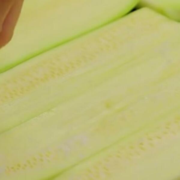 Tikvicu isecite na jako tanke kolutove, a u činiji pomešajte sitno iseckan beli luk, jaja, kumin, bosiljak i parmezan i začinite sa malo soli i bibera.