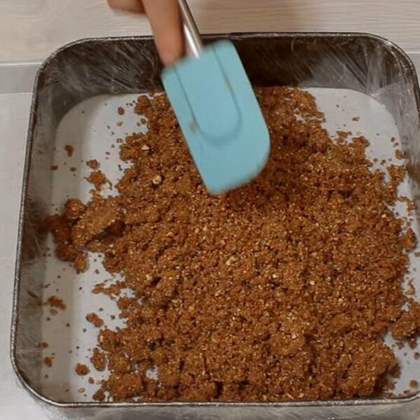 Maslac otopite, pa ga pomešajte sa mlevenim keksom i dodajte nutelu. Mešajte dok ne dobijete mrvičastu smesu, koju ćete potom prebaciti u kalup prečnika 24 cm i formirati koru.