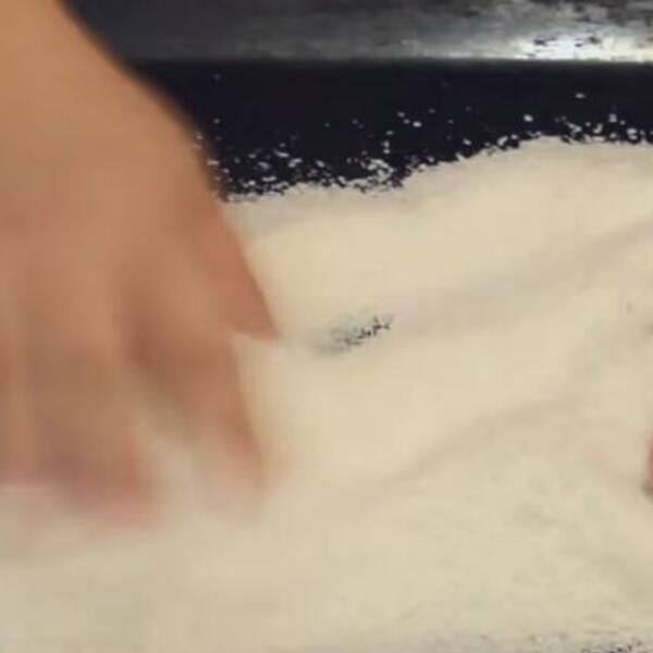 U veliki pleh posuti sav kokos i rasporediti ravnomerno svuda, protresite tepsiju levo – desno.