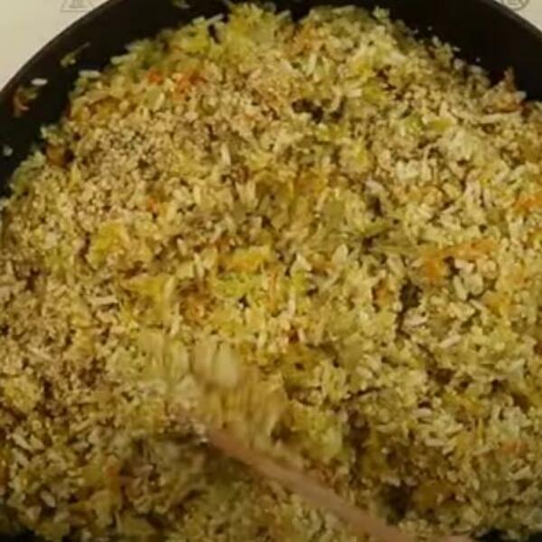 Dolijte pola litre vode i dinstajte dok pirinač ne bude na pola skuvan. Dodajte začine po ukusu, so, biber, vlašac, mlevenu papriku.