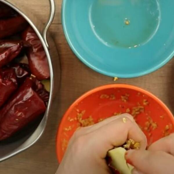 Suve paprike potopite u vruću vodu i ostavite ih sa strane dok pripremate nadev.