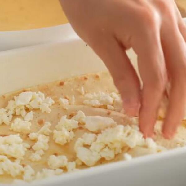 Na vrh stavite malo fila od sira i tako do utroška materijala.. Preostalu mešavinu jaja i mleka sipajte preko. Pecite 20-25 minuta na 180°C.