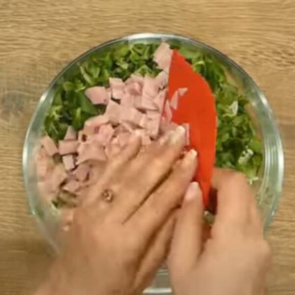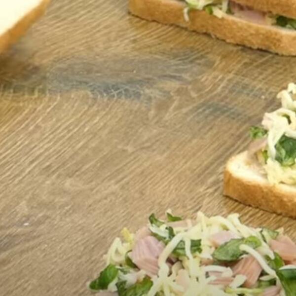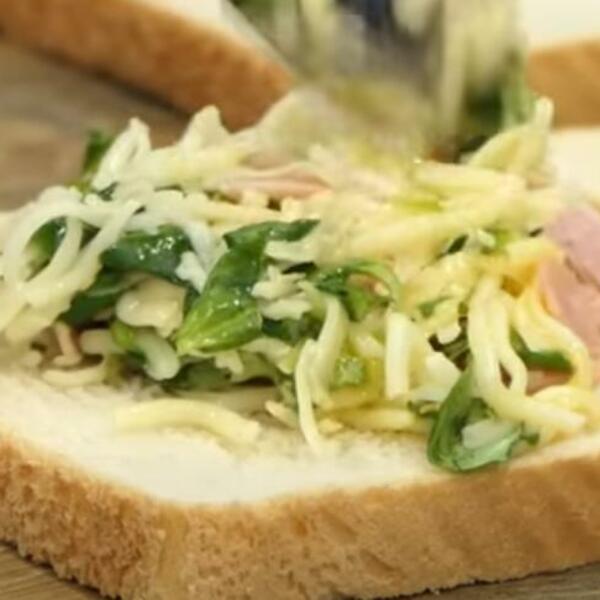U činiji pomešajte rendan kačkavalj, seckanu šunku i seckan spanać. Dodajte 1 jaje i dobro promešajte. Smesu namažite na 4 kriške hleba, prekrijte ih sa još 4 kriške hleba.
