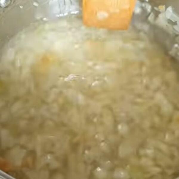 Nakon što provri, smanjite na tihu vatru i ostavite da se krčka sat vremena. Zatim dodajte kockice krompira i grašak i ostavite da se krčka dok krompir ne bude potpuno mekan.