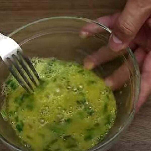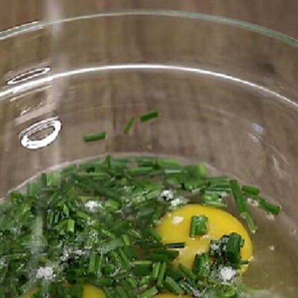 U činiju razbijte jaja, dodajte so, biber i seckani vlađac pa umutite.