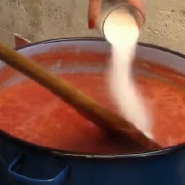 Paradajz najpre prelijte vrelom vodom kako biste ga lakše oljuštili. Isecite ga na četvrtine i stavite u šerpu zajedno sa vinskim sirćetom, šećerom i biberom. Promešati sve, staviti na ringlu i pržiti. Kad počne da vri neka vri 1 sat.
