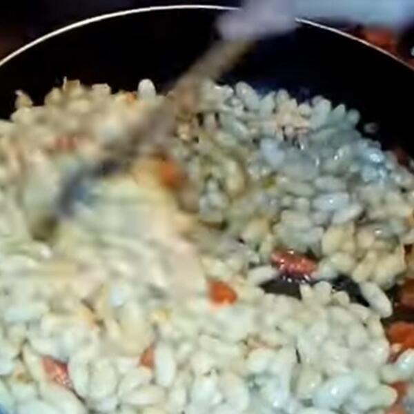 Dodajte lovorov list, začinsku papriku, brašno, so, biber, suvi biljni začin i sve dobro izmešajte. Na kraju dodajte sitno iseckan beli luk i skuvani pasulj sa vodom.