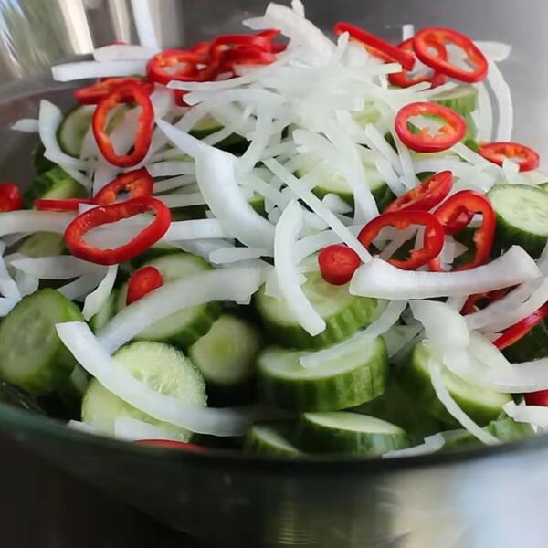 Krastavac isecite na kolutove, pa dodajte ljutu papričicu seckanu na kolutove i crni luk isečen na rebarca. Posolite i lepo promešajte. Pokrijte providnom folijom i ostavite u frižideru 2-4 sata. Zatim izvadite iz frižidera i procedite, pa ostavite u cediljci i ispirajte vodom nekih 3-4 minuta.