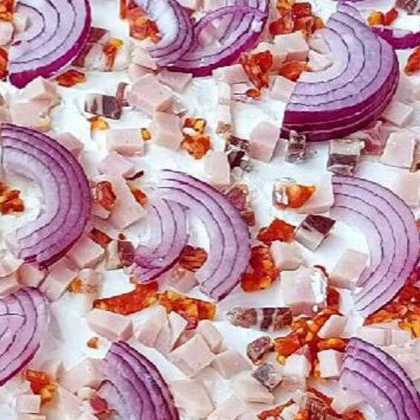 U posudicu staviti paradajz pire, maslinovo ulje i začine i viljuškom dobro umešati. Presovanu šunku narezati na kockice.