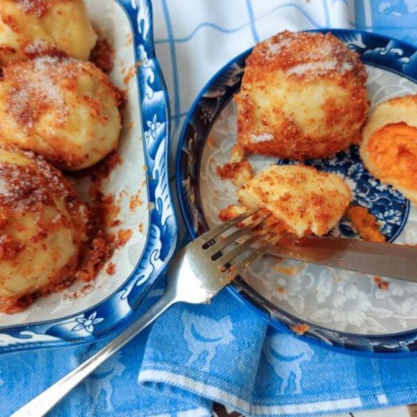 Šupljom kašikom vaditi knedle i pažljivo spuštati na prezlu. Drmusanjem tiganja uvaljati ih u prezlu i posuti kristal šećerom.