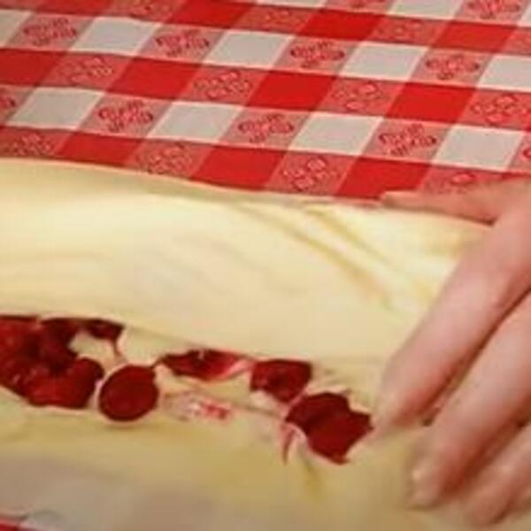 Na nju rasporedite 1/3 nadeva sa višnjama (po cijeloj kori, samo ne po rubovima). Dva krajnja kraja testa uvijte na unutarnju stranu i sve skupa uvijte ( na taj način vam neće u toku pečenja iscuriti nadev). Uvijenu pitu odložiti u tepsiju na papir za pečenje.