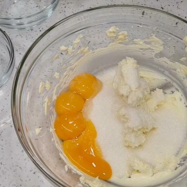 U mast dodajte šećer i dobro umutete. Zatim dodajte žumanca i belance i mutite dok se sve ne sjedini.