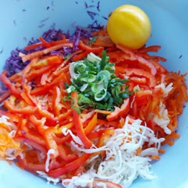 Šargarepu i jabuku izrendati na rende.Luk iseći sitno .Posoliti i iscediti ceo limun.