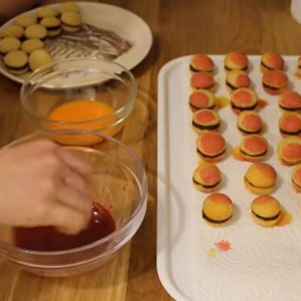 Jestive boje pomešajte sa vodom u dve posude, pa breskvice umočite prvo u žutu, potom u crvenu boju.