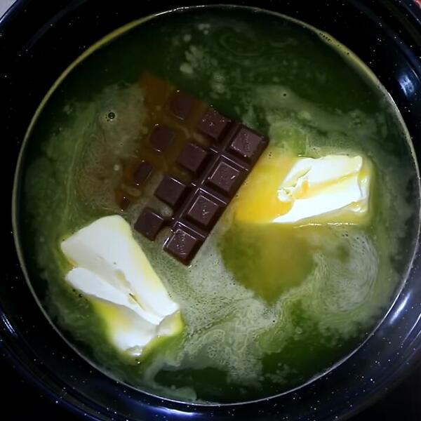 U veću šerpu ulijte vodu, sipajte šećer, ubacite margarin i čokoladu izlomljenu na kocke pa stavite na šporet i zagrevajte na srednjoj vatri uz mešanje dok se sve ne otopi. Neka proključa, pa kuvajte još 2-3 minuta i skinite sa vatre.