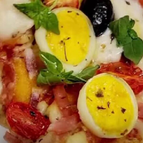 Paradajz sos pomešajte sa maslinovim uljem i origanom pa time premažite celo testo. Stavite u zagrejanu rernu na 200 stepeni i pecite 20 minuta. Zatim picu pospite rendanim kačkavaljem, stavite seckan crveni luk, šunku, čeri paradajz, svežu mocarelu, masline i seckana kuvana jaja. Pospite origanom i vratite u rernu na 25 minuta.