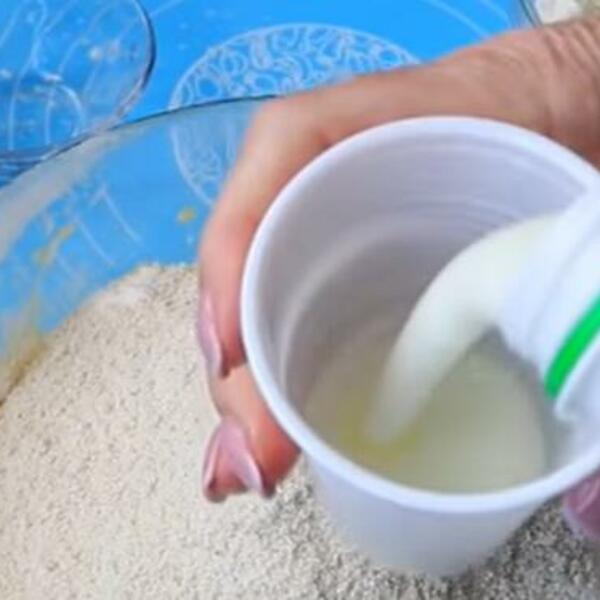 Isitnite sir, dodajte umućena jaja, kisello mleko ili jogurt, ulje, brašno i prašak za pecivo.