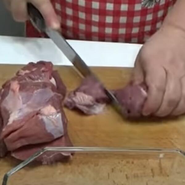 Dodati kašiku aleve paprike i čašu vode pa lepo izmešati. Meso iseckati na kockice pa ubaciti u šerpu i dinstati još desetak minuta.