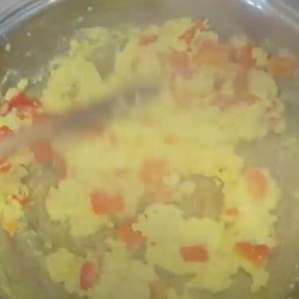 4. Dodajte smesu s jajima, pa okrećite i mrvite jaja otprilike dva minuta. Poslužite odmah dok je toplo.