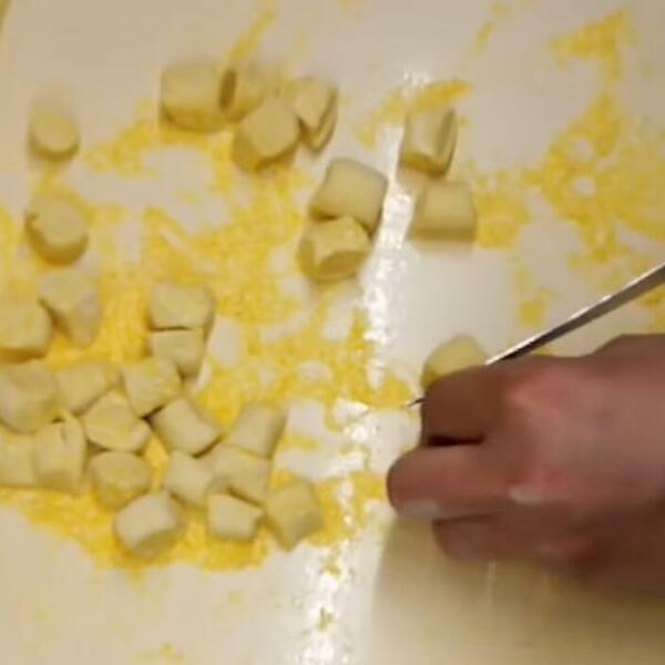 Ostavite da proključa. Testo podelite na dva dela i oba razvucite oklagijom. Isecite rezanca ili kockice, pa kuvajte u vodi dok ne ispliva na površinu, pa ostavite još par minuta.