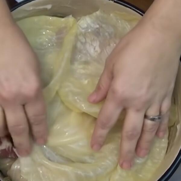 8. Kada iskoristite celu smesu i napunite lonac sarmama na vrh stavite ostatak iseckanog kupusa.