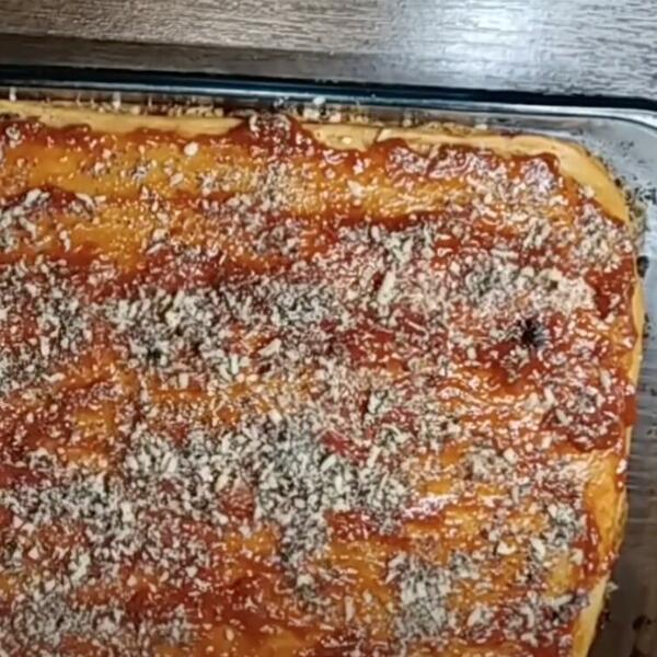 U posudi pomešajte orahe i šećer i podelite na 4 jednaka dela. Razvucite testo dimenzija 20x30 cm, pa ga stavite u nauljen pleh istih dimenzija. Premažite koru džemom, pa pospite šećerom i orasima. Preko stavite sledeću koru, pa opet premažite džemom i pospite orasima i šećerom.