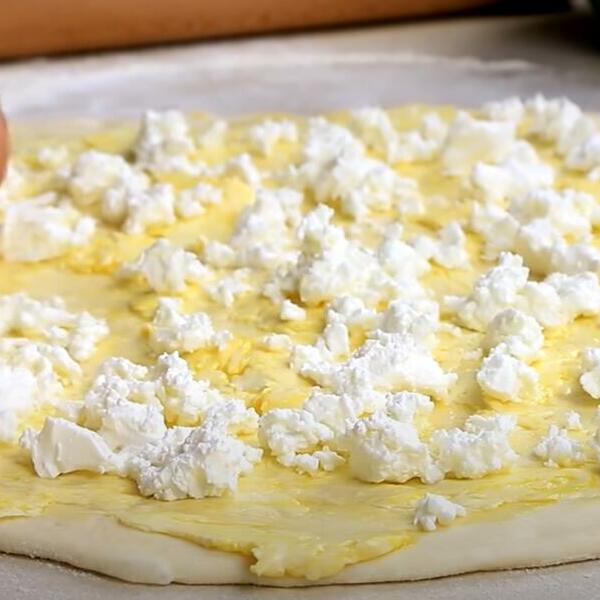 Premesite i podelite na četiri dela.Svaki deo razvucite i filujte umućenim maslacem sa jejetom. Odozgo stavite sir ili šta želite, umotajte i oštrim nožem secite ukoso da dobijete trouglove.