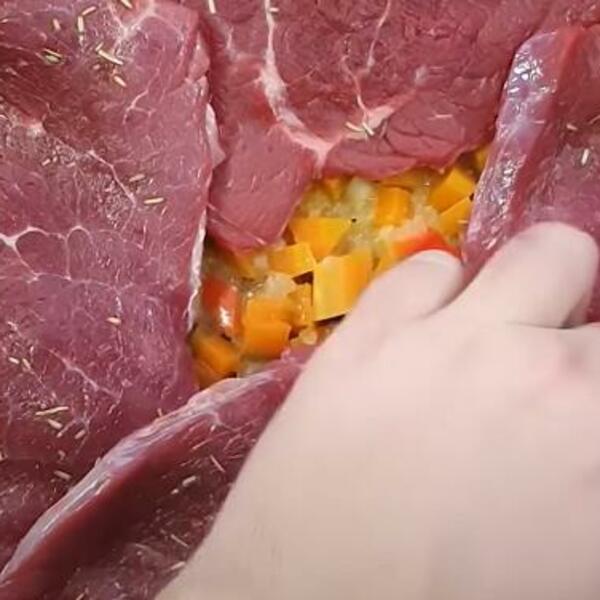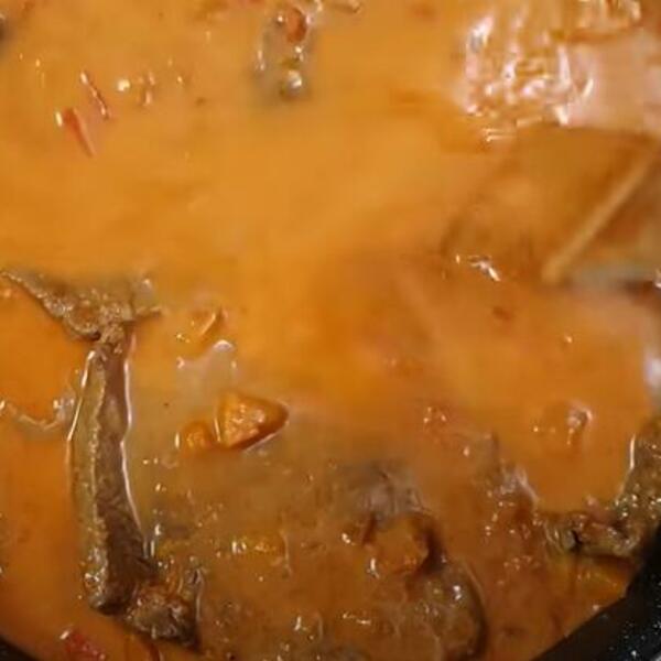 Izvaditi meso na tanjir, dodati 200 ml vode zadnji put i začine po želji: so, biber i crvenu papriku, vratiti meso i dinstati 20 minuta.