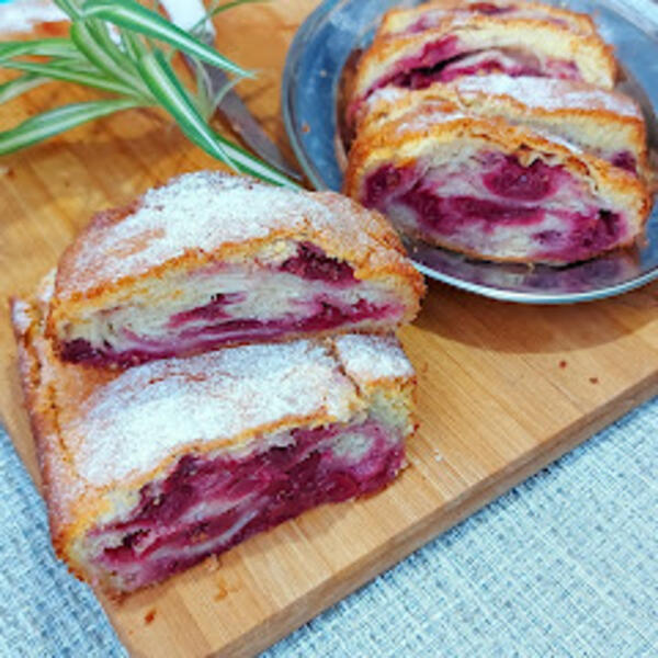 Posuti plovinom višanja pa uviti u rolnicu.Sledeću ponoviti postupak stim sto prvu rolnicu staviti u drugu i zajedno sve uviti u rolat.