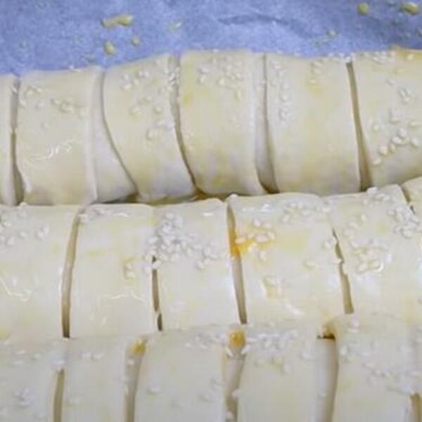 Nakon toga ga podelite na dva dela. Svaki deo razvijte što tanje, polovinu izreckajte nožem, a polovinu namažite filom od sira i jaja, a onda dodajte i slaninu - po želji. Umotajte stavite u tepsiju i pecite oko 20 minuta na 200 stepeni Celzijusa, a potom još 5 minuta na 180 stepeni Celzijusa.