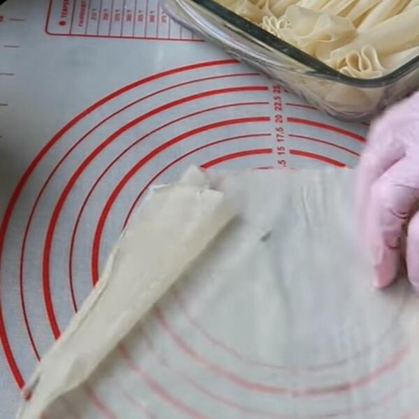 Staviti četiri kore u pleh, tako što ćete staviti na sva četiri zida od pleha po jednu. Kore staviti tako da vam pola kore bude van pleha. Preko poprskati uljem, pa opet staviti jednu koru preko celog pleha. Sledeće kore koje stavljate će biti po dve koje ćete nabrati uzdžno, pa fil. Tako raditi dok ne potrošite sve kore.