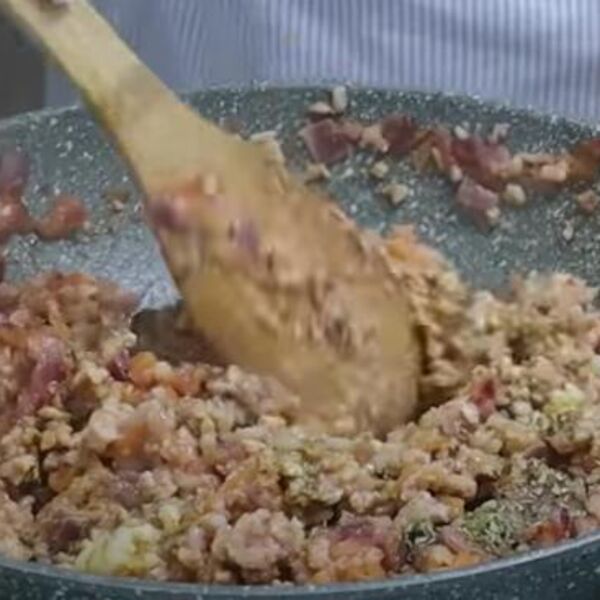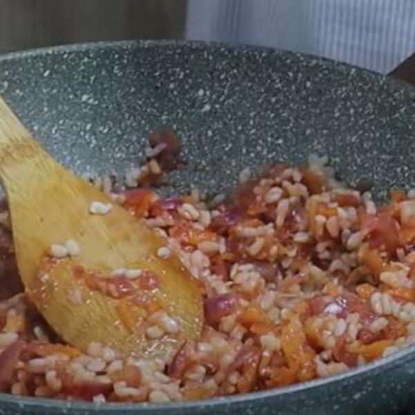 Priprema: Iseckajte crni luk, pa ga prodinstajte na ulju. Dodajte rendanu šargarepu i paradajz sos. Dodajte i prokuvan integralni pirinač. Dodajte i pola kg pilećeg mlevenog mesa.
