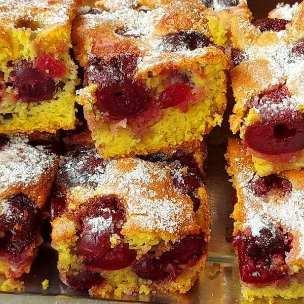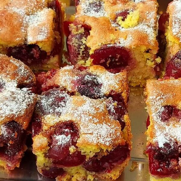 Sipati u pleh 28 x 18 ili 20 i rasporediti. Pobaceti trešnje što više i peći na 200 stepeni C.