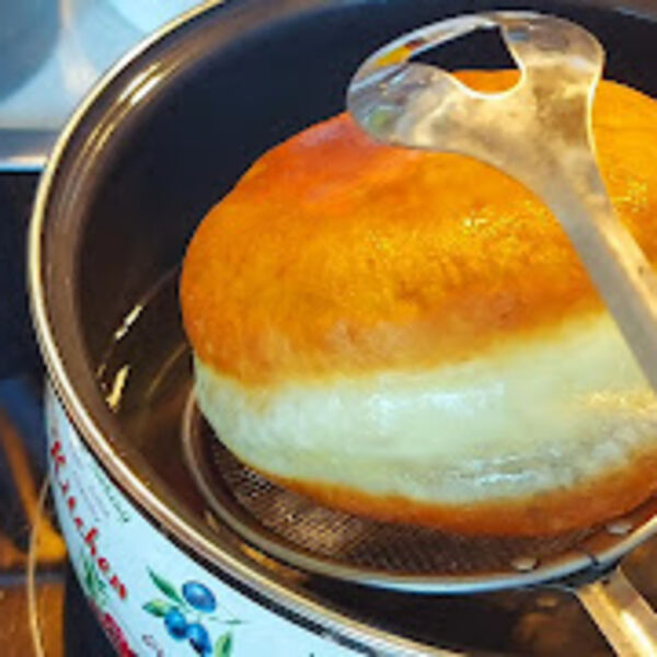 U ulje spuštati krofne zajedno sa papirom pa papir vaditi posle par sekunde. Okrenuti kad porumeni