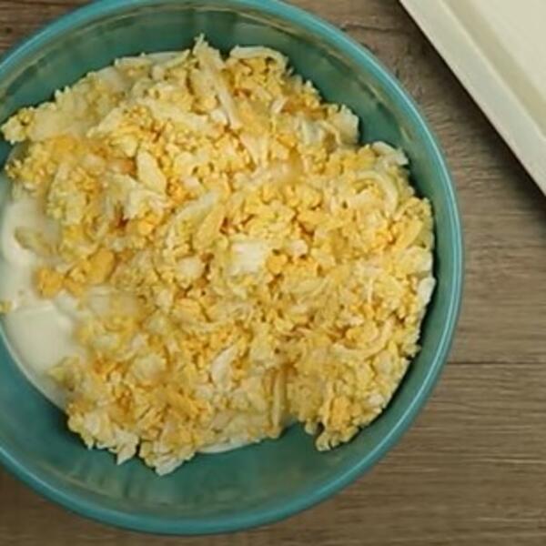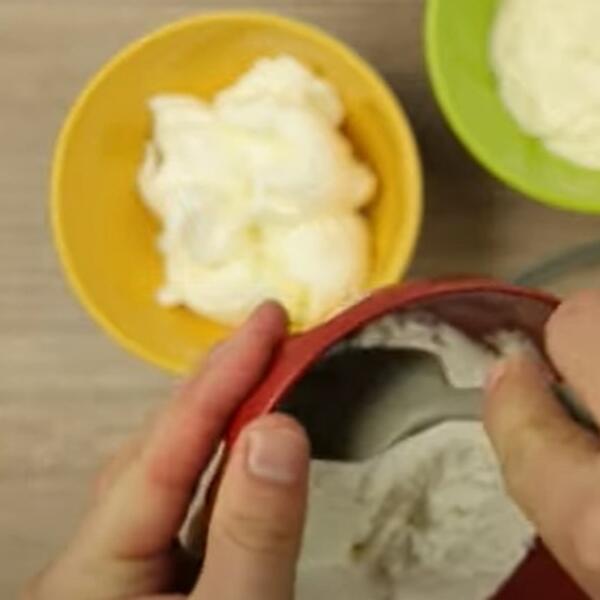 U činiju stavimo kram sir, majonez i pavlaku. Mešamo dok se sve lepo je sjedini. Podelimo na tri dela.