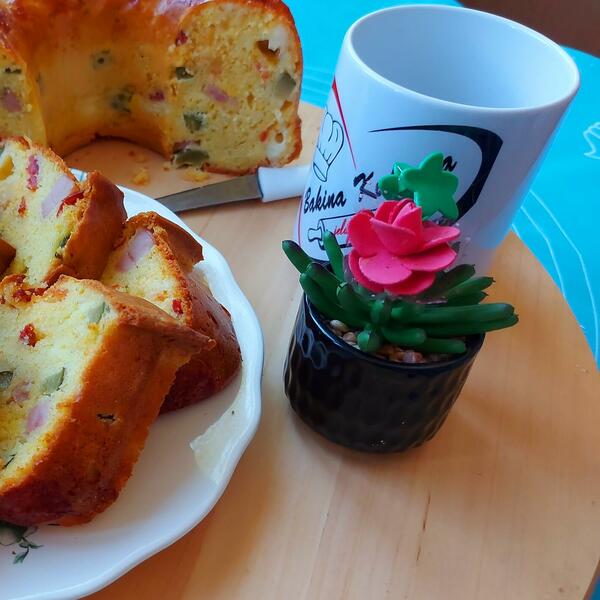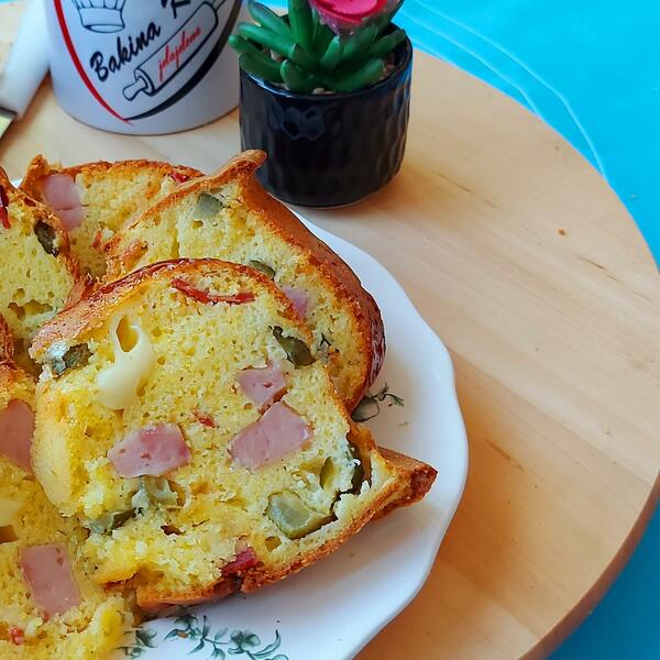 - Umutiti jaja dodati malo soli bibera brašno sa praškom za pecivo, šunku na kockice, kačkavalj na kockice,krastavčići na kockice , ulje, jogurt i sve dobro izmešati,
