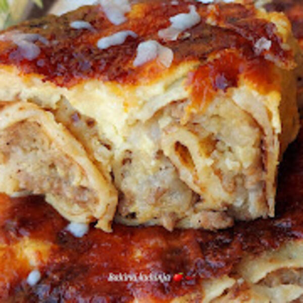 Ispeći palačinke .Palačinku raširiti na sto, staviti punu kašiku nadeva, 1 list kačkavalja, saviti palacinku odozdo sa strane do kraja. Ređati u podmazan pleh. Izmešati pavlaku, jogurt i jaje pa dodati malo soli i preliti.