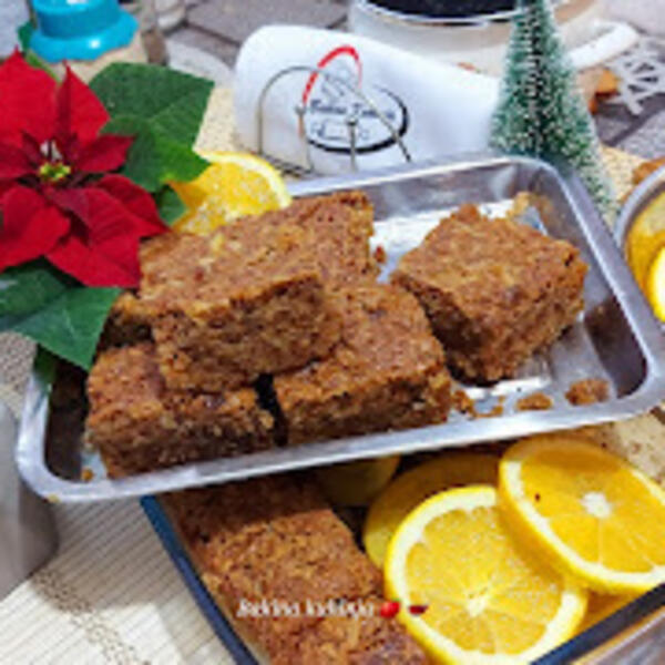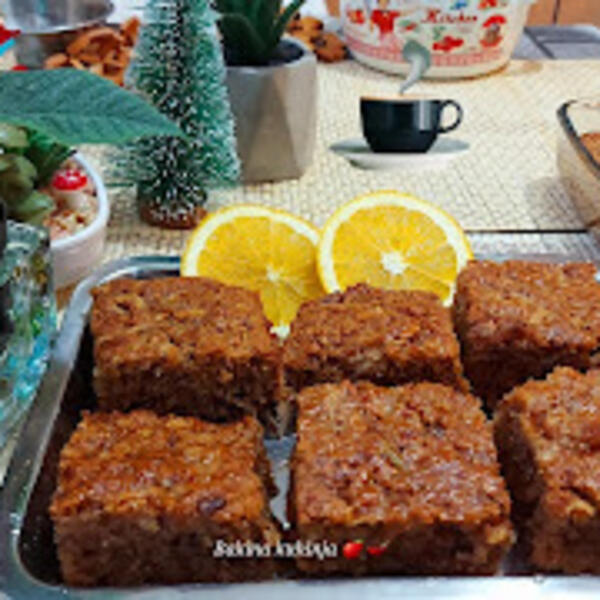 U vanglu dodati brašno prosejano sa praškom za pecivo i sodom bikarbonom, dodati orahe, korica narandže, jabuke rendane sa šećerom, smokve sok ulje i sve dobro izjednačliti.