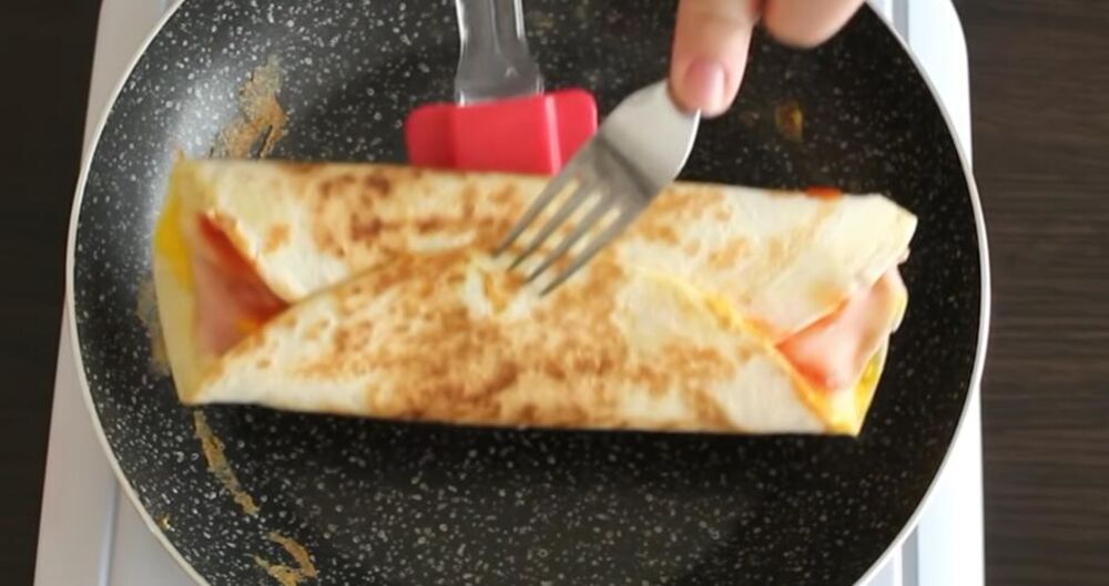 Preko poslednje tortilje sipajte preostalo umućeno jaje, pa poklopite. Sa svake strane pecite po 5 minuta, pa služite.