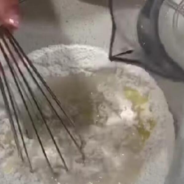 Sipati u činiju kiselu vodu i ulje, pa postepeno i uz mešanje dodavati prethodno pomešane suve sastojke: brašno, so, prašak za pecivo i sodu bikarbonu.